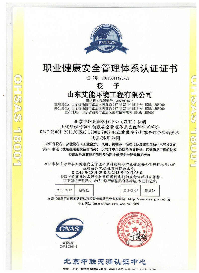 職業(yè)健康安全管理體系認(rèn)證證書